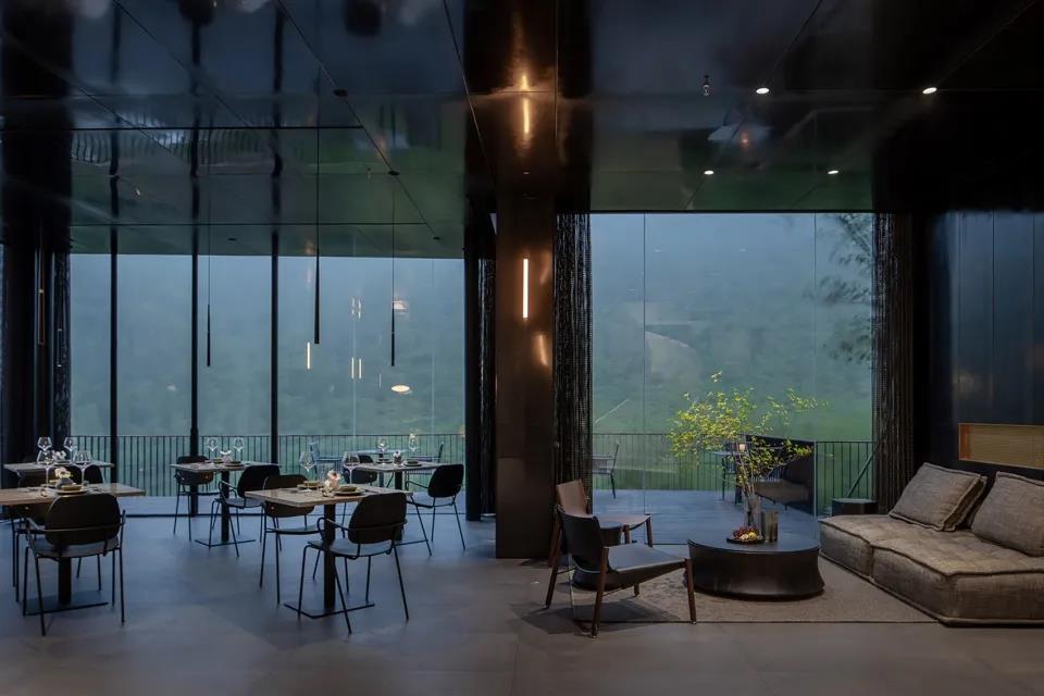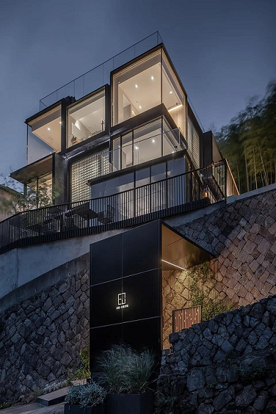 項目基地位于莫干山度假區(qū),建筑外立面的設(shè)計中根據(jù)不同房間的觀景及空間的私密性要求,大面積運用了三種玻璃材料,透明玻璃,U型玻璃及玻璃磚作為“魔方”的九宮格,結(jié)構(gòu)上通過加固鋼結(jié)構(gòu)來形成“魔方”九宮格的黑色骨架支撐,將整個建筑外立面割裂,形成強(qiáng)烈的戲劇沖突,同時也將理性與曖昧發(fā)揮到極致。