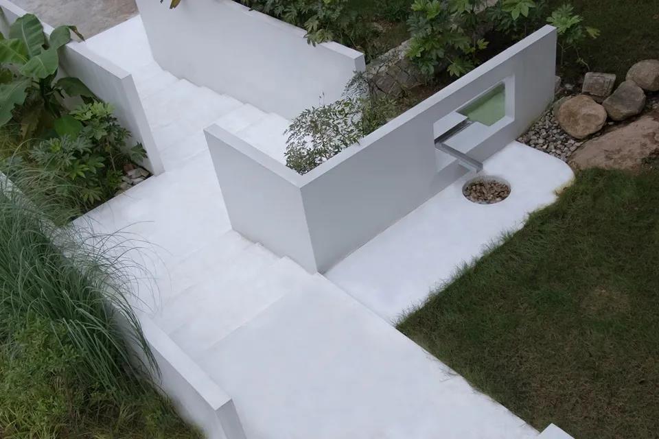 項目位于莫干山國際登山步道41號,接手時建筑立面已完成且無法改動,所以設(shè)計重點主要在景觀環(huán)境與室內(nèi)展開。景觀營造以白色為主,為后期做展提供更多色彩可能性,又與周邊的綠色相得益彰??头恳惨允止じ休^強(qiáng)的白水泥墻、淺色木紋、藤編等材質(zhì)為主,相應(yīng)的家具也進(jìn)行了設(shè)計,極簡的家具在生產(chǎn)成本和視覺上也達(dá)到了一個比較好的平衡點。