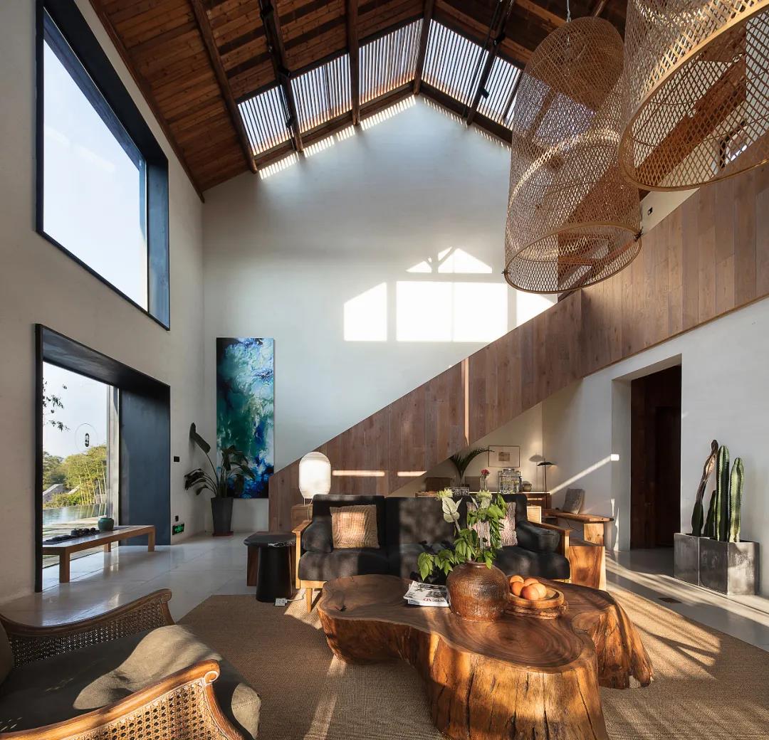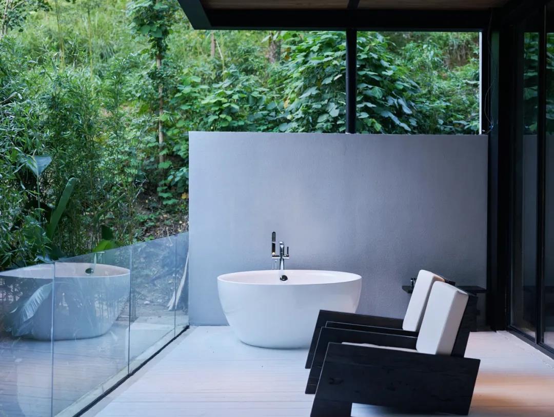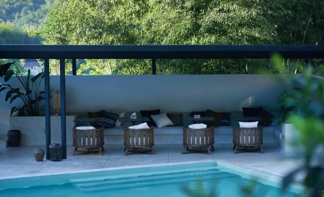 語自在·安吉,兩期建筑,共12間,侘寂風(fēng)全智能化現(xiàn)代科技客房;7個公區(qū):良食餐廳,喜水泳池,云居茶歇,草廬茶室,老灶頭,玻璃花房,千坪大草甸,功能配置豐富.二號樓的公區(qū)——草廬茶室,南北對通,前廳后花園,陽光下的芭蕉葉,如翡翠般的透綠。詫寂和現(xiàn)代度假風(fēng)的融合形成平和溫暖的建筑山水關(guān)系,相得益彰。