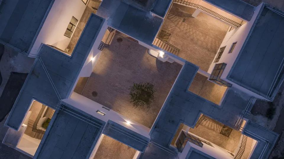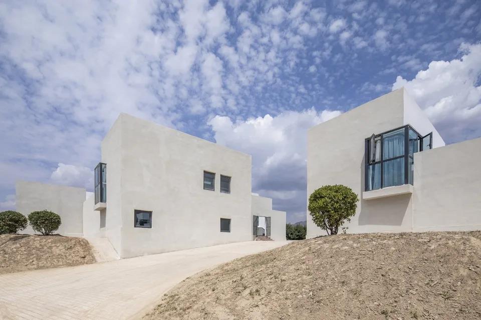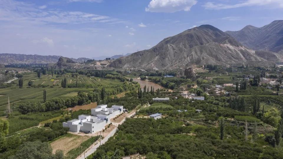 該項目位于甘肅省東鄉(xiāng)族自治縣唐汪鎮(zhèn)馬巷村。新民宿的建筑形態(tài)借鑒了當(dāng)?shù)氐慕ㄖ鹘y(tǒng),采取了內(nèi)合院的形式,在南北兩地塊上分別設(shè)計了兩組內(nèi)合院建筑。每個內(nèi)合院建筑由4個獨立的小院構(gòu)成,半地下的設(shè)計也使得該建筑在該地區(qū)漫長的冬季中可以借助土地本身的保溫性而節(jié)能。